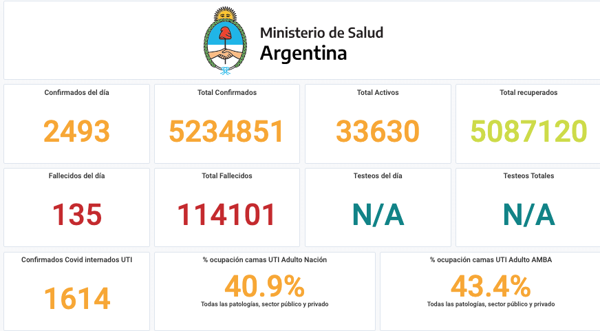 El Ministerio de Salud de la Nación informó este jueves 16 de septiembre que se registraron 135 muertes y 2.493 nuevos contagios de coronavirus. De esta manera, el país acumula un total de 5.234.851 casos positivos desde el comienzo de la pandemia, mientras que los fallecimientos son 114.101.