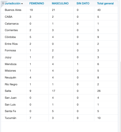 También fallecieron 19 mujeres en Buenos Aires; 3 en la Ciudad de Buenos Aires; 2 en Corrientes; 5 en Córdoba; 2 en Entre Ríos; 1 en Formosa; 1 en Jujuy; 1 en Mendoza; 1 en Misiones; 4 en Neuquén; 1 en Río Negro; 9 en Salta; y 7 en Tucumán.