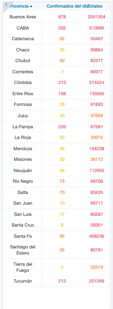 El total de acumulados por distrito indica que la provincia de Buenos Aires suma 2.051.304 casos; la Ciudad de Buenos Aires, 510.896; Catamarca, 50.467; Chaco, 99.884; Chubut, 82.377; Corrientes, 90.977; Córdoba, 514.524; Entre Ríos, 135.950; Formosa, 61.693; Jujuy, 47.668; La Pampa, 67.581; La Rioja, 33.070; Mendoza, 164.238; Misiones, 36.172; Neuquén, 112.955; Río Negro, 99.706; Salta, 83.435; San Juan, 69.711; San Luis, 80.287; Santa Cruz, 59.351; Santa Fe, 468.236; Santiago del Estero, 80.781; Tierra del Fuego, 32.319; y Tucumán, 201.269.