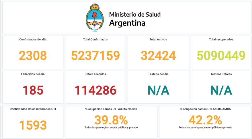 El Ministerio de Salud de la Nación informó este viernes que se registraron 185 fallecimientos y 2.308 nuevos contagios de coronavirus. Con estos datos, el país acumula un total de 5.237.159 casos positivos desde el comienzo de la pandemia. En tanto, los fallecimientos son 114.286.