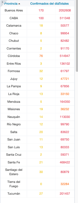 El total de acumulados por distrito indica que la provincia de Buenos Aires suma 2.052.608 casos; la Ciudad de Buenos Aires, 511.348; Catamarca, 50.577; Chaco, 99.954.; Chubut, 82.482; Corrientes, 91.170; Córdoba, 514.947; Entre Ríos, 136.102; Formosa, 61.797; Jujuy, 47.721; La Pampa, 67.856; La Rioja, 33.150; Mendoza, 164.350; Misiones, 36.232; Neuquén, 113.030; Río Negro, 99.790; Salta, 83.622; San Juan, 69.750; San Luis, 80.333; Santa Cruz, 59.371; Santa Fe, 468.422; Santiago del Estero, 80.879; Tierra del Fuego, 32.284; y Tucumán, 201.457.