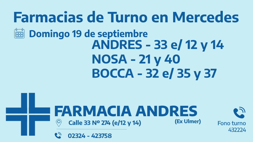 Farmacias de turno del domingo 19 de septiembre 19 septiembre, 2021Desde las 8:30 del día de hoy hasta la misma hora de mañana, las farmacias de turno en Mercedes son: Andrés, Nossa y Bocca.Comparte esto: Haz clic para compartir en WhatsApp (Se abre en una ventana nueva) WhatsApp Haz clic para compartir en Telegram (Se abre en una ventana nueva) Telegram Haz clic para compartir en X (Se abre en una ventana nueva) X Haz clic para compartir en Facebook (Se abre en una ventana nueva) Facebook TE PUEDE INTERESARCOMENTARIOS Comentarios