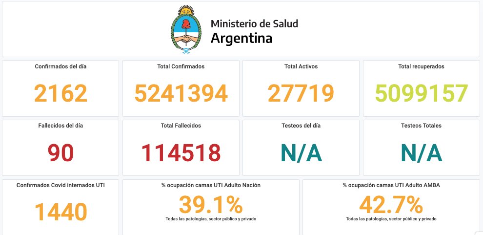 El Ministerio de Salud de la Nación informó este lunes 20 de septiembre que se registraron 90 muertes y 2.162 nuevos contagios de coronavirus. De esta manera, el país acumula un total de 5.241.394 casos positivos desde el comienzo de la pandemia, mientras que los fallecimientos son 114.518.