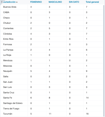 De los decesos reportados hoy, 55 son hombres y 35 son mujeres. La provincias que más muertes registraron fueron Tucumán, Santa Fe y Neuquén con 16, 14 y 9 decesos, respectivamente. El parte precisó que murieron 55 hombres, tres en la provincia de Buenos Aires; tres en la Ciudad de Buenos Aires; uno en Chaco; cinco en Corrientes; tres en Córdoba; uno en Entre Ríos; uno en Formosa; cuatro en La Pampa; uno en Mendoza; uno en Misiones; cuatro en Neuquén; dos en Salta; uno en San Juan; tres en San Luis; uno en Santa Cruz; ocho en Santa Fe; uno en Santiago del Estero; uno en Tierra del Fuego y 11 en Tucumán. También fallecieron 35 mujeres: cuatro en Buenos Aires; dos en Chubut; dos en Corrientes; cuatro en Córdoba; once en Formosa; dos en La Pampa; una en La Rioja; una en Mendoza; cinco en Neuquén; una en San Juan; 6 en Santa Fe y cinco en Tucumán.