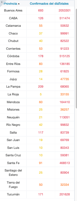 El total de acumulados por distrito indica que la provincia de Buenos Aires suma 2.053.301 casos; la Ciudad de Buenos Aires, 511.474; Catamarca, 50.632; Chaco, 99.991; Chubut, 82.522; Corrientes, 91.223; Córdoba, 515.125; Entre Ríos, 136.185; Formosa, 61.825; Jujuy, 47.735; La Pampa, 68.065; La Rioja, 33.155; Mendoza, 164.410; Misiones, 36.257; Neuquén, 113.051; Río Negro, 99.832; Salta, 83.739; San Juan, 69.769; San Luis, 80.343; Santa Cruz, 59.381; Santa Fe, 468.513; Santiago del Estero, 80.904; Tierra del Fuego, 32.334 y Tucumán, 201.628.