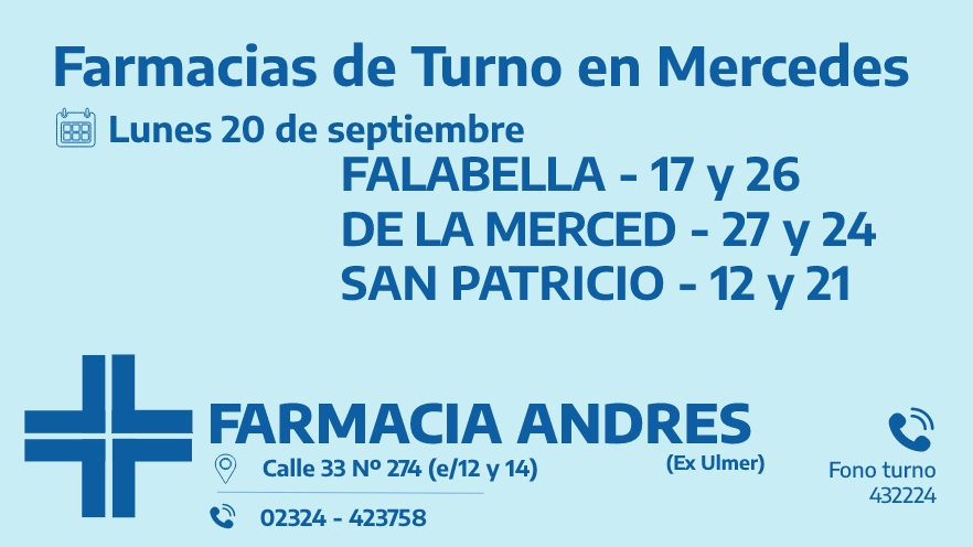 Desde las 8:30 del día de hoy, hasta la misma hora de mañana, las farmacias de turno en Mercedes son: Falabella, De la Merced y San Patricio