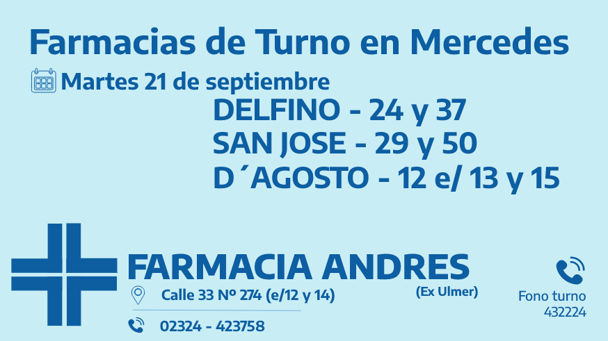 Desde las 8:30 del dia de hoy hasta la misma hora de mañana, las farmacias de turno en Mercedes son: Delfino, San José y D’Agosto