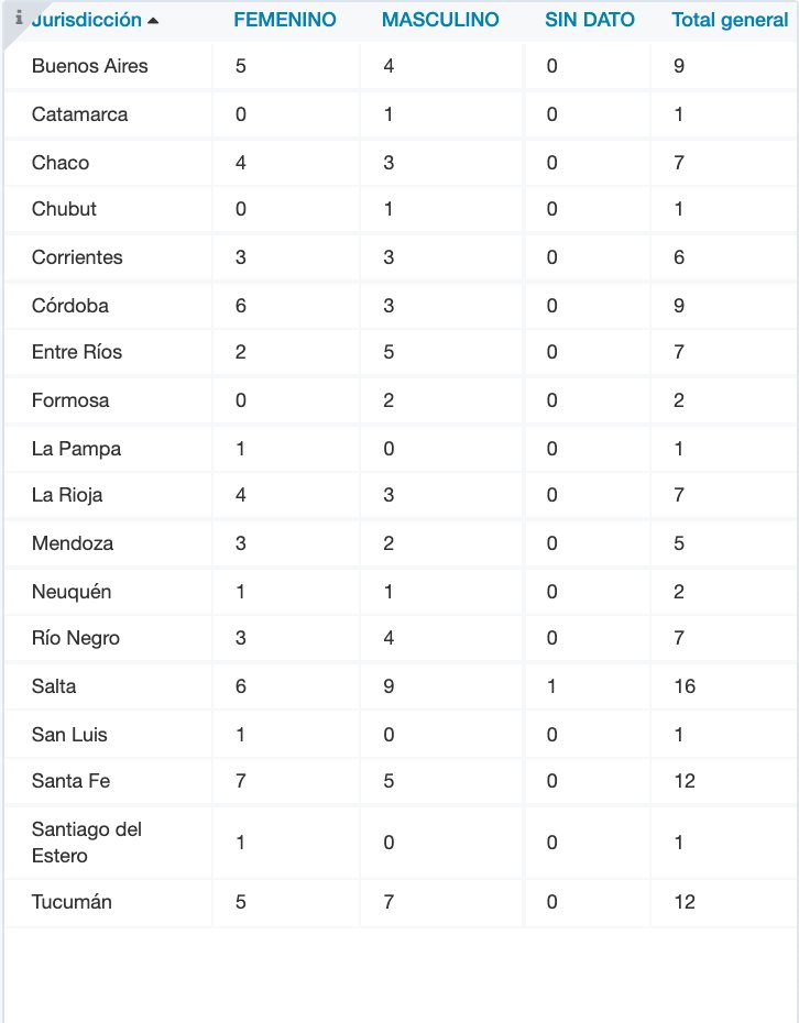 El parte precisó que murieron 4 hombres en la provincia de Buenos Aires; 1 en Catamarca; 3 en Chaco; 1 en Chubut; 3 en Corrientes; 3 en Córdoba; 5 en Entre Ríos; 2 en Formosa; 3 en La Rioja; 2 en Mendoza; 1 en Neuquén; 4 en Río Negro; 9 en Salta; 5 en Santa Fe y 7 en Tucumán. También fallecieron 5 mujeres en Buenos Aires; 4 en Chaco; 3 en Corrientes; 6 en Córdoba; 2 en Entre Ríos; 1 en La Pampa; 4 en La Rioja; 3 en Mendoza; 1 en Neuquén; 3 en Río Negro; 6 en Salta; 1 en San Luis; 7 en Santa Fe; 1 en Santiago del Estero y 5 en Tucumán.