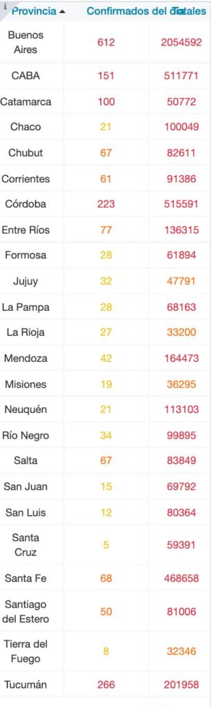 De los 1.837 nuevos contagios notificados esta tarde, 612 son de la provincia de Buenos Aires, 151 de la ciudad de Buenos Aires, 100 de Catamarca, 21 de Chaco, 67 de Chubut, 61 de Corrientes, 223 de Córdoba, 77 de Entre Ríos, 28 de Formosa, 32 de Jujuy, 28 de La Pampa, 27 de La Rioja, 42 de Mendoza, 19 de Misiones, 21 de Neuquén, 34 de Río Negro, 67 de Salta, 15 de San Juan, 12 de San Luis, 5 de Santa Cruz, 68 de Santa Fe, 50 de Santiago del Estero, 8 de Tierra del Fuego y 266 de Tucumán.