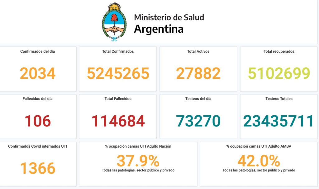 El Ministerio de Salud de la Nación informó este miércoles 22 de septiembre que se registraron 106 muertes y 2.034 nuevos contagios de coronavirus. Con estos datos, el país acumula un total de 5.245.265 casos positivos desde el comienzo de la pandemia, mientras que los fallecimientos son 114.684.