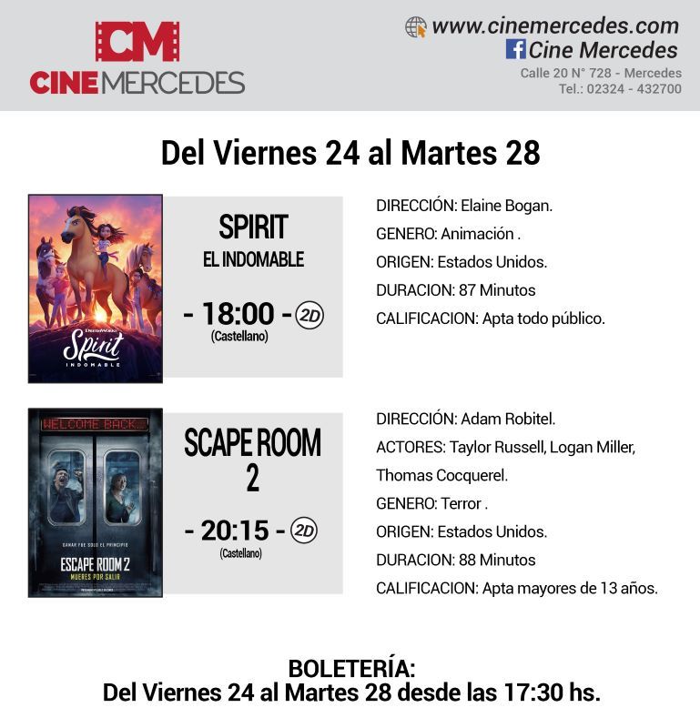 Del viernes 24 al martes 28 de septiembre, el Cine Mercedes presentará dos películas. Para los más pequeños se proyectará «Spirit, el indomable» en las funciones de la hora 18, mientras que en la función de la hora 20:15 se podrá ver «Scape Room 2»