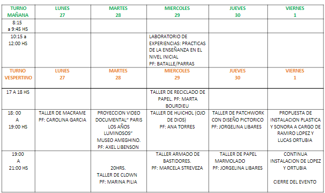«Los talleres son con inscripción previa en la escuela, no hay requisitos, es para quien quiera ir. La instalación del viernes es un espectáculo de un par de performatas que no son de la escuela. Es una muestra de obras plásticas, videos y música que ellos hacen. En tanto, el laboratorio es una actividad que van a hacer las profes de práctica. Los alumnes están trabajando con el nivel inicial y van a hacer actividades con eso», explicó Boffi agregando que los interesados podrán acercarse a la insitución de calle 24 entre las 9 y las 21 para inscribirse o consultar más detalles sobre las propuestas.