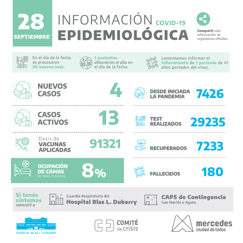 Lamentamos informar el fallecimiento de un paciente de 41 años de edad. A su vez, en el día de hoy se detectaron 4 casos positivos en 50 test. 91321 dosis de la vacuna fueron ya aplicadas a mercedinos y mercedinas.