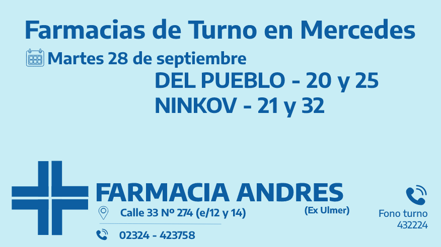 Farmacias de turno del martes 28 de septiembre 28 septiembre, 202128 septiembre, 2021Desde las 8:30 del día de hoy hasta la misma hora de mañana, las farmacias de turno en Mercedes son: Del Pueblo y NinkovComparte esto: Haz clic para compartir en WhatsApp (Se abre en una ventana nueva) WhatsApp Haz clic para compartir en Telegram (Se abre en una ventana nueva) Telegram Haz clic para compartir en X (Se abre en una ventana nueva) X Haz clic para compartir en Facebook (Se abre en una ventana nueva) Facebook TE PUEDE INTERESARCOMENTARIOS Comentarios