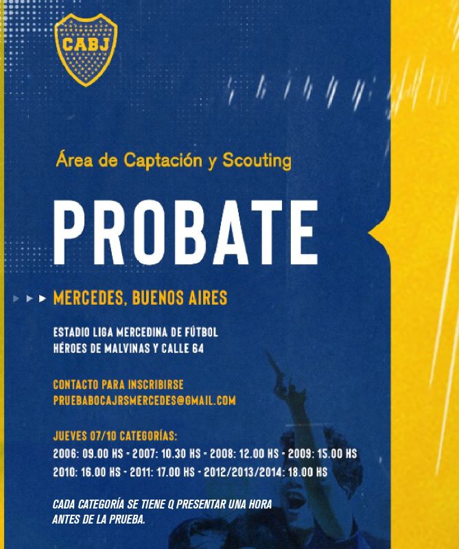 El Área de Captación y Scouting del Club Atlético Boca Juniors estará el próximo jueves 7 de octubre haciendo prueba de jugadores locales de las categorías 2014 a 2006. Las pruebas serán en el cancha de la Liga Mercedina de Futbol. Los interesados deben inscribirse previamente.
