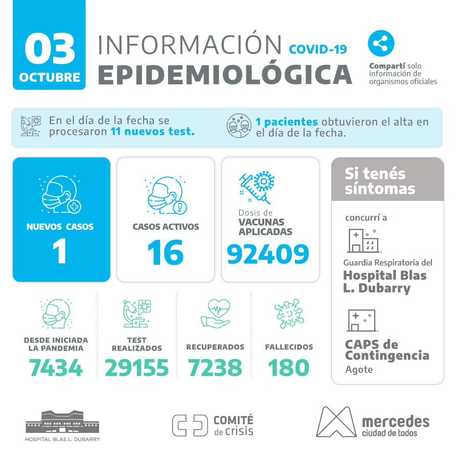 El informe epidemiológico de este domingo confirma el procesamiento de 11 nuevos test, de los cuales uno dio positivo, por lo tanto, son 16 los pacientes que transitan la enfermedad, ya un paciente obtuvo el alta en el día de la fecha.
