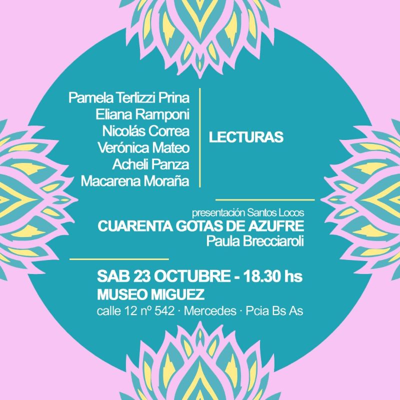 El próximo 23 de octubre, desde las 18:30 horas, en los jardines del Museo Víctor Míguez, se presentará el poemario de Paula Brecciaroli que lleva el título «Cuarenta Gotas de Azufre». El evento contará con la presencia de la autora y escritores invitados de Mercedes y Capital Federal.