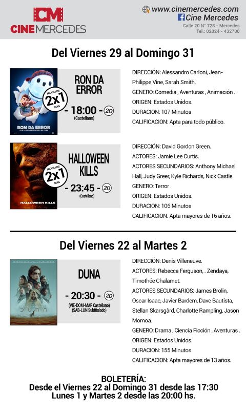 Entre al viernes 29 de octubre y el martes 2 de noviembre, el Cine Mercedes presenta tres películas en su pantalla. En la función central de la hora 20:30 se estrena DUNA, película de ciencia ficción. En tanto, desde viernes al domingo, continúa en cartelera «Ron da Error» (18 horas) y «Halloween Kills» (23:45 horas).