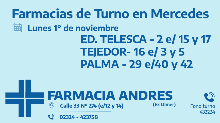 Desde las 8:30 del día de hoy hasta la misma hora de mañana, las farmacias de turno en Mercedes son: Eduardo Telesca, Tejedor y Palma.