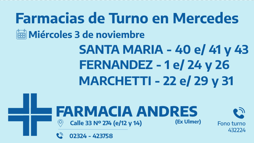 Desde las 8:30 del día de hoy hasta la misma hora de mañana, las farmacias de turno de Mercedes son: Santa María, Fernández y Marchetti.