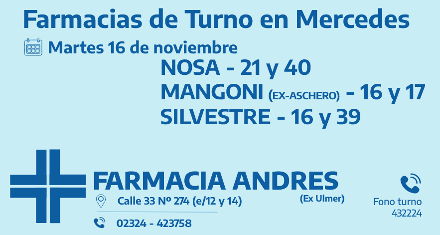 Desde las 8 30 del día de hoy hasta la misma hora de mañana las farmacias de turno en Mercedes son: Nosa, Mangoni y Silvestre.