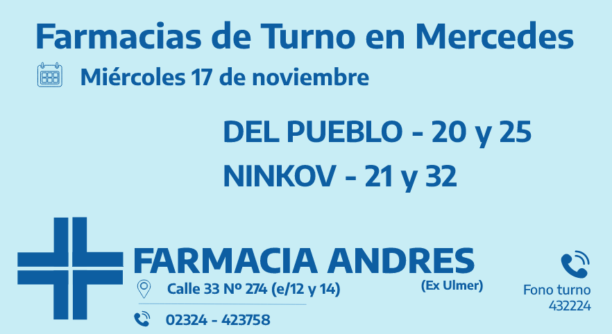 Farmacias de turno del miércoles 17 de noviembre 17 noviembre, 2021Desde las 8:30 del día de hoy, hasta la misma hora de mañana, las farmacias de turno en Mercedes son: Del Pueblo y Ninkov.Comparte esto: Haz clic para compartir en WhatsApp (Se abre en una ventana nueva) WhatsApp Haz clic para compartir en Telegram (Se abre en una ventana nueva) Telegram Haz clic para compartir en X (Se abre en una ventana nueva) X Haz clic para compartir en Facebook (Se abre en una ventana nueva) Facebook TE PUEDE INTERESARCOMENTARIOS Comentarios