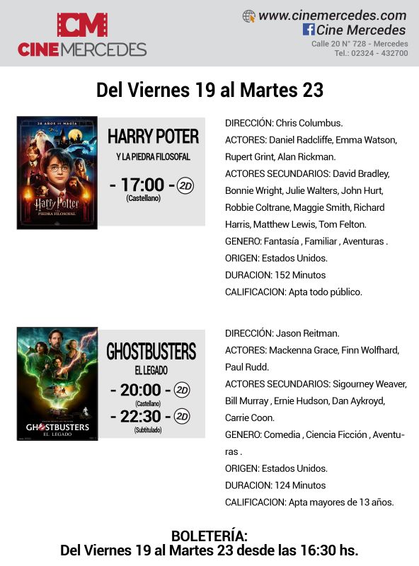Desde el viernes 19 al martes 23 de noviembre, el Cine Mercedes presenta dos películas con mucha magia y fantasía. A veinte años de su estreno en los cines del mundo, vuelve a la gran pantalla «Harry Potter y la Piedra Filosofal». En la función de la hora 17, la primera parte de la saga del joven mago y sus hechizos. En tanto, en las funciones de las 20 y las 22:30 horas, llega al cine local una nueva Cazafantasmas, «Ghostbusters, el legado».