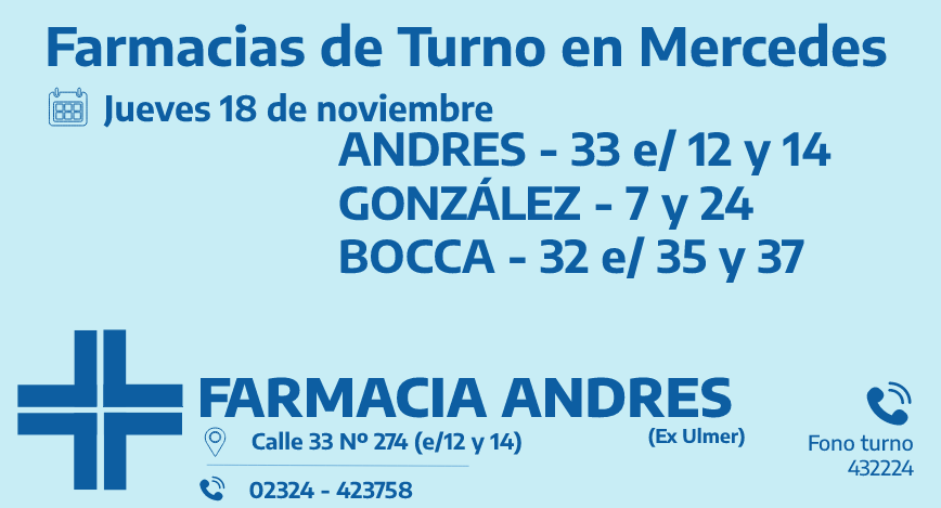 Desde las 8:30 del día de hoy hasta la misma hora de mañana, las farmacias de turno en Mercedes son: Andrés, González y Bocca.