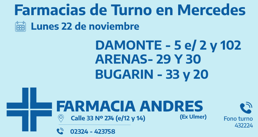 Desde las 8 30 del día de hoy hasta la misma hora de mañana las farmacias de turno en Mercedes son: Damonte, Arenas y Bugarin.