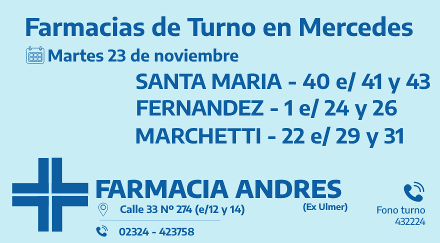 Desde las 8 30 del día de hoy hasta la misma hora de mañana las farmacias de turno en Mercedes son: Santa María, Fernández y Marchetti