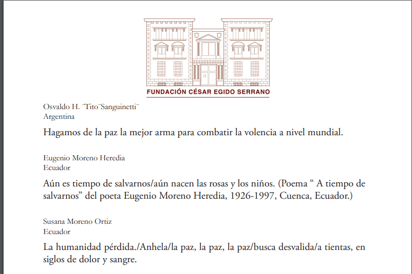 El 23 de noviembre y con motivo de la celebración del Dia de la Palabra, el patronato de la Fundación César Egido Serrano, encabezado por su presidente D. Fernando Lucerón Egido su secretaria Dña. Maria Consolación Egido Serrano, D. Enrique Ugedo Egido, Doña Blanca Egido Serrano y D. Fernando Lucerón, hicieron entrega al Padre Angel Garcia, presidente de “Mensajeros de la Paz”, del primer volumen editado del Libro por la Paz, confeccionado a partir de los más de 1.400 mensajes recibidos desde muy diferentes partes del mundo, con el deseo de que la paz y al concordia usando como vinculo la palabra lleguen hasta el último rincón del planeta y sobre todo hasta los despachos donde se toman decisiones que afectan a toda la sociedad,