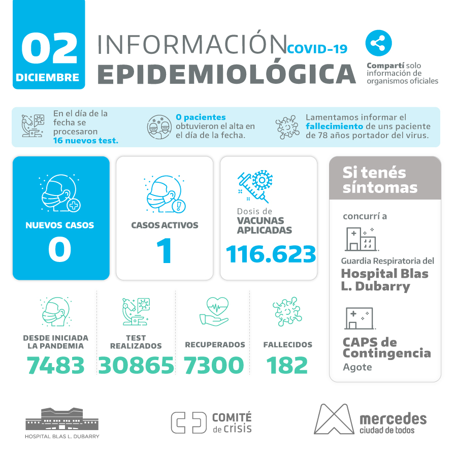 El cierre diario dejó la lamentable noticia de 1 fallecido portador del virus. A su vez, no hubo nuevos positivos en 16 testeos realizados en el día de la fecha. Tampoco altas, mientras que arribamos a 116.623 dosis aplicadas de la vacuna contra el virus en el partido de Mercedes.