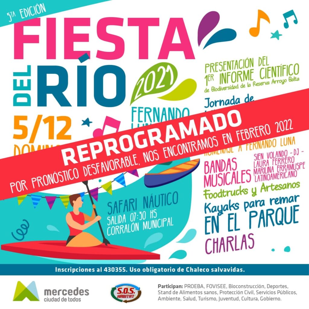 La “Fiesta del Río” que se planificaba realizar este domingo por cuestiones climáticas se posterga para el mes de febrero. Desde la organización de la actividad, a cargo de S.O.S Hábitat y la Dirección de ambiente municipal, tomaron la determinación ante el pronóstico desfavorable.