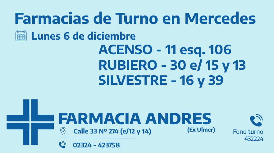 Desde las 8:30 del día de hoy hasta la misma hora de mañana, las farmacias de turno en Mercedes son: Acenso, Rubiero y Silvestre.