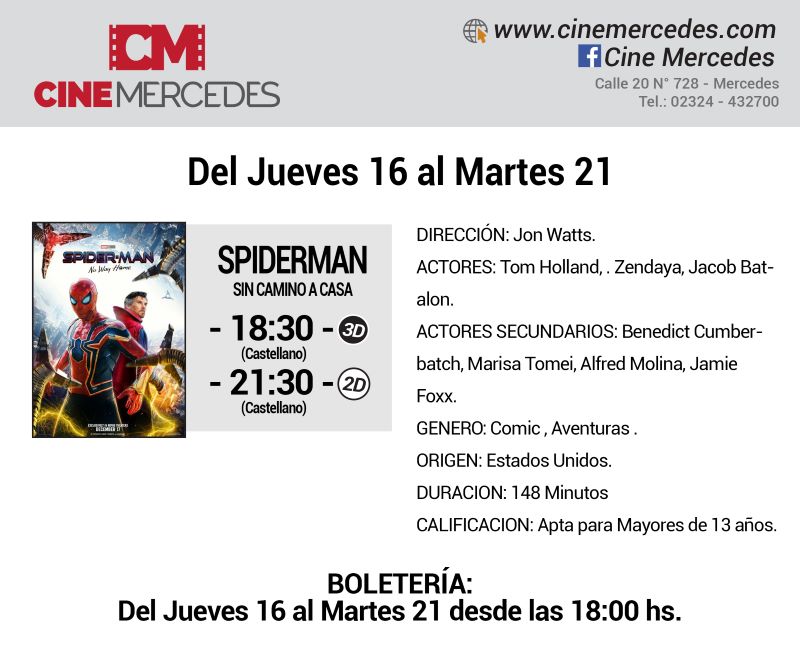 En simultáneo con otros cine del país, el Cine Mercedes estará estrenando este jueves 16 de diciembre la nueva «Spiderman, lejos de casa». Esperada por loa fanáticos de los superhéroes, las entradas se fueron vendiendo con antelación y se pueden adquirir de manera anticipada para las funciones de las 18:30 y de las 21:30, en 3D y en 2D, en castellano. La nueva Spiderman podrá verse en el cine de la ciudad hasta el martes 21 de diciembre.