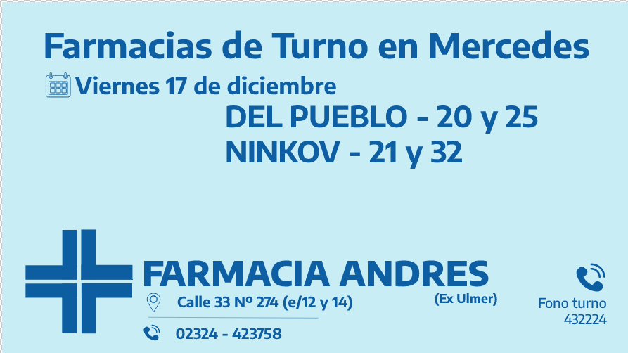 Farmacias de turno del viernes 17 de diciembre 17 diciembre, 2021Desde las 8:30 del día de hoy hasta la misma hora de mañana, las farmacias de turno en Mercedes son: Del Pueblo y Ninkov.Comparte esto: Haz clic para compartir en WhatsApp (Se abre en una ventana nueva) WhatsApp Haz clic para compartir en Telegram (Se abre en una ventana nueva) Telegram Haz clic para compartir en X (Se abre en una ventana nueva) X Haz clic para compartir en Facebook (Se abre en una ventana nueva) Facebook TE PUEDE INTERESARCOMENTARIOS Comentarios