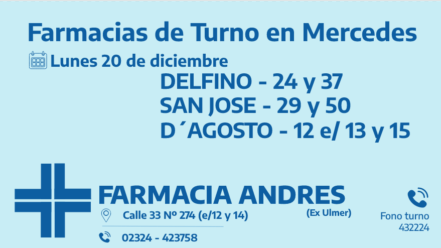 Desde las 8:30 del día de hoy hasta la misma hora de mañana, las farmacias de turno en Mercedes son: Delfino, San José y D’Agosto.