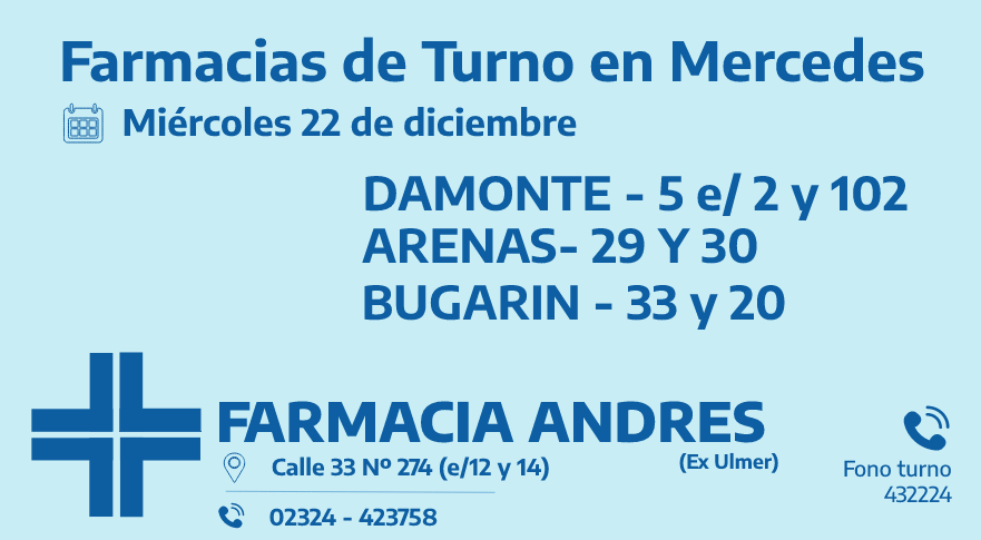 Desde las 8:30 del día de hoy hasta la misma hora de mañana, las farmacias de turno en Mercedes son: Damonte, Arenas y Bugarín.