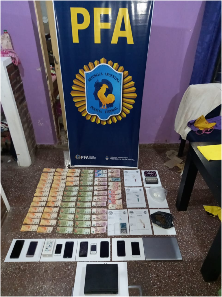 El informe policial expresa: «El pasado miércoles 22 de diciembre, en horas de la tarde, los Agentes Federales con asiento en la ciudad de Mercedes, dieron cumplimiento a la medida judicial allanando el citado domicilio, donde se logró la detención de una mujer mayor de edad, argentina, domiciliada en el lugar, y el secuestro de una importante cantidad de clorhidrato de cocaína y marihuana fraccionadas para la venta, una fuerte suma de dinero en efectivo en billetes de baja denominación producto de la comercialización de las sustancias ilícitas, y distintos elementos de corte y fraccionamiento, como así también equipos de telefonía celular y elementos informáticos.
