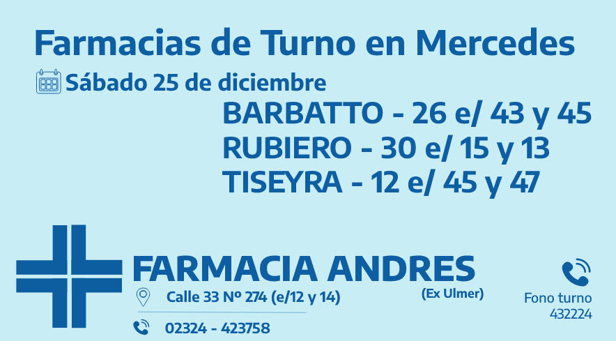 Desde las 8 30 del día de hoy hasta la misma hora de mañana las farmacias de turno en Mercedes son: Barbatto, Rubiero y Tiseyra.