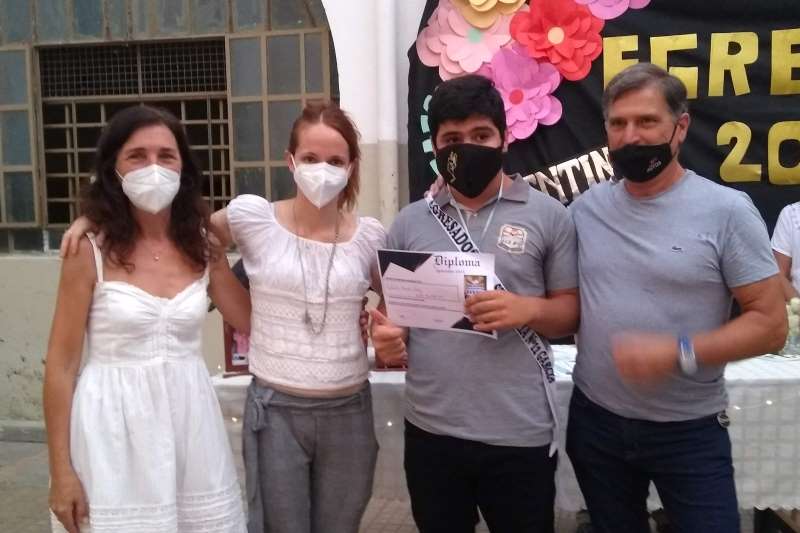 Daniela Cantero, Valentín Pérez, Eliana Sampallo, Juan Francisco Schenone y Micaela Villalba a medida que fueron nombrados, recibieron primero medallas y diplomas, entregada por los docentes y por sus familias. Luego sus padrinos entregarían regalos para los chicos que orgullosos lucían su cinta con la leyenda de “Egresados 2021 Secundaria 12 García”.