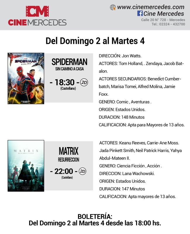Luego de unos días cerrados por el feriado de año nuevo, el Cine Mercedes presentará dos películas de acción que continúa en la cartelera: Spiderman y Matrix. La secuelta del Hombre Arañan se puede ver en la función de la hora 18:30, mientras que la «Resurrección» de Neo y Trinity en la función de la hora 22.