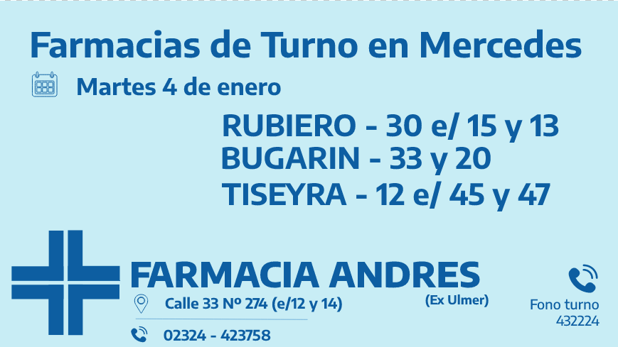 Desde las 8:30 del día de hoy hasta la misma hora de mañana las farmacias de turno en Mercedes son: Rubiero, Bugarín y Tiseyra.