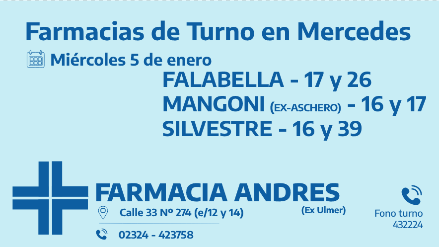 Desde las 8 30 del día de hoy hasta la misma hora de mañana las farmacias de turno en Mercedes son: Falabella, Mangoni y Silvestre