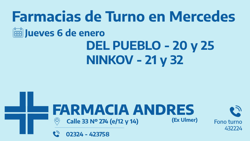 Farmacias de turno del jueves 6 de enero 6 enero, 2022Desde las 8 30 del día de hoy hasta la misma hora de mañana las farmacias de turno en Mercedes son: Del Pueblo y Ninkov.Comparte esto: Haz clic para compartir en WhatsApp (Se abre en una ventana nueva) WhatsApp Haz clic para compartir en Telegram (Se abre en una ventana nueva) Telegram Haz clic para compartir en X (Se abre en una ventana nueva) X Haz clic para compartir en Facebook (Se abre en una ventana nueva) Facebook TE PUEDE INTERESARCOMENTARIOS Comentarios