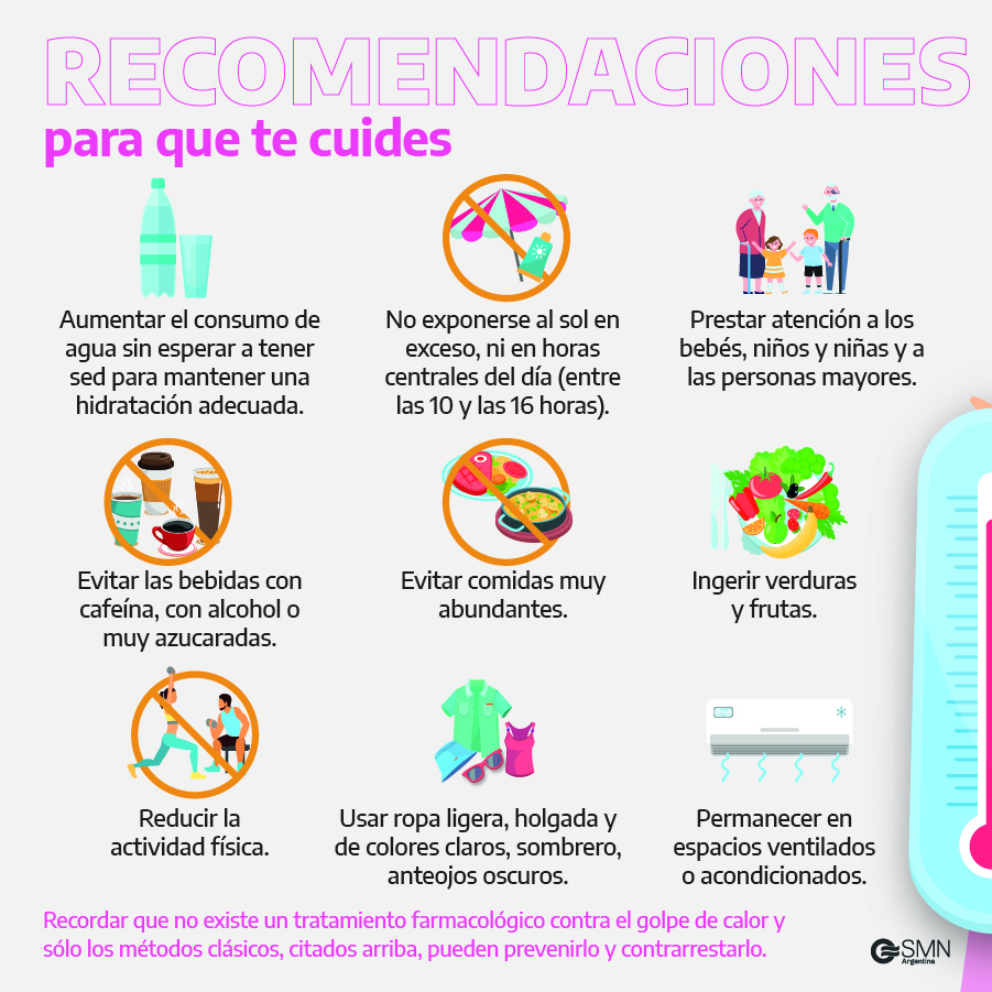 Las altas temperaturas ponen en riesgo la salud de las personas, especialmente de los mayores de 60 años y de los bebés y niños. Los períodos de altas temperaturas pueden provocar un golpe de calor, caracterizado por fuerte dolor de cabeza, pérdida de la conciencia, aumento extremo de la temperatura corporal, mareo y sequedad en la piel.