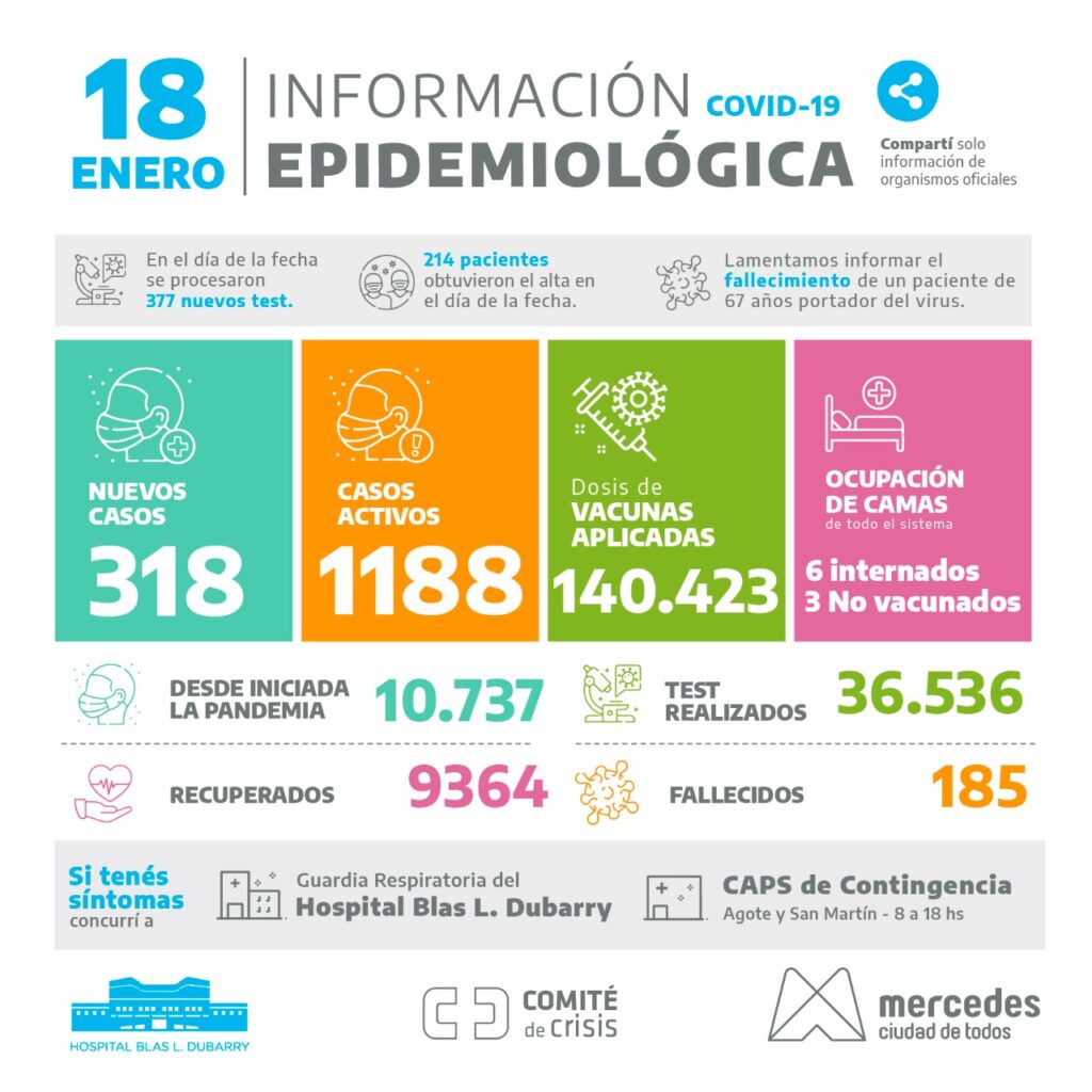 Jornada con récord de positivos en Mercedes con 318 casos detectados sobre 377 test efectuados en los distintos centros distribuidos por la ciudad. A su vez, hay 140.423 dosis de la vacuna aplicadas en todo el Partido. Al igual que en el país y el mundo el nivel de contagio y positividad es elevado.