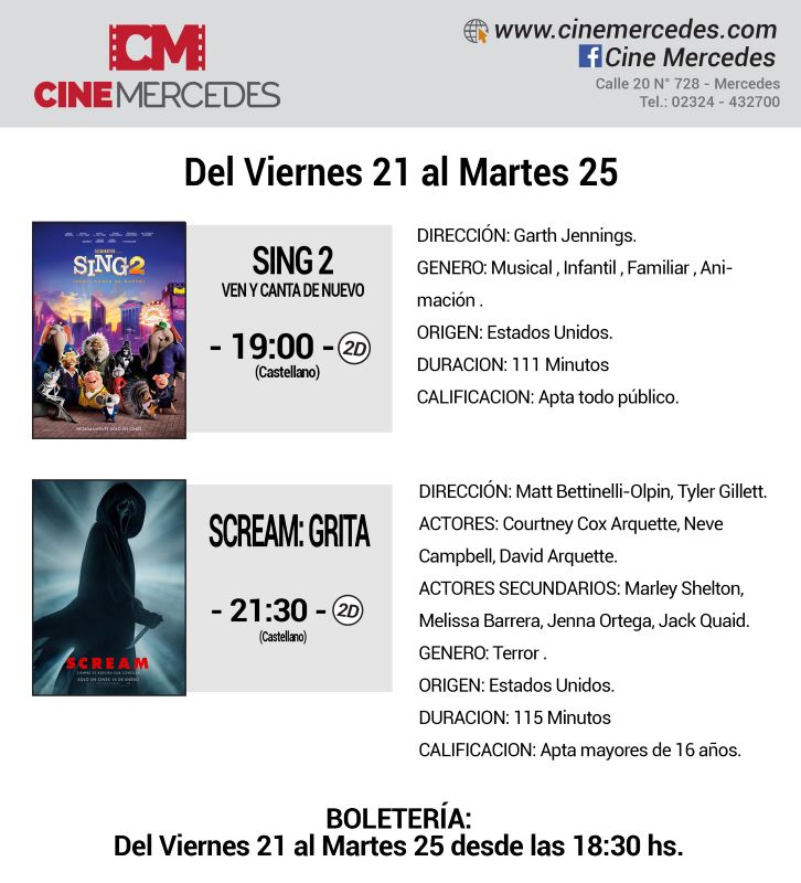Del viernes 21 al martes 25 de enero, el Cine Mercedes estará proyectando dos películas. Continúa en pantalla el film animado «Sing 2, ven y canta de nuevo» (en la función de las 19 horas) y se estrena la quinta película de la saga Scream después de 25 años de su primera parte (en la función de las 21:30).