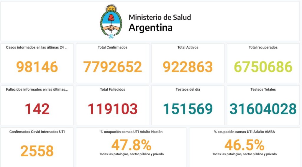 El Ministerio de Salud de la Nación informó este sábado 22 de enero que, en las últimas 24 horas, se registraron 142 muertes y 98.146 nuevos contagios de coronavirus. El total de casos desde el comienzo de la pandemia ascendió a 7.792.652, mientras que los fallecimientos suman 119.103.
