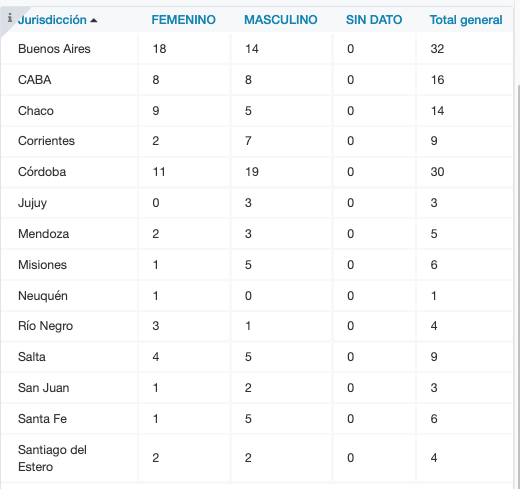 El parte precisó que murieron 79 hombres, 63 mujeres y se registró una persona sin identificación de género. Respecto a las 63 mujeres, 18 fallecieron en la Provincia de Buenos Aires, 8 en CABA, 9 en Chaco, 2 en Corrientes, 11 en Córdoba, 2 en Mendoza, 1 en Misiones, 1 en Neuquén, 3 en Río Negro, 4 en Salta, 1 en San Juan, 1 en Santa Fe, y 2 en Santiago del Estero. El detalle de los 79 hombres fallecidos es el siguiente: 14 en la Provincia de Buenos Aires, 8 en CABA, 5 en Chaco, 7 en Corrientes, 19 en Córdoba, 3 en Jujuy, 3 en Mendoza, 5 en Misiones, 1 en Río Negro, 5 en Salta, 2 en San Juan, 5 en Santa Fe, y 2 en Santiago del Estero.